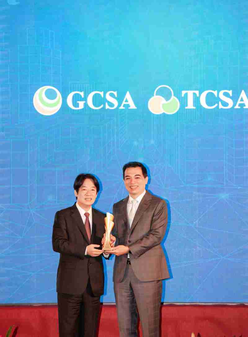 达全方位永续表现获全球永续奖及台湾永续奖肯定,,由副总统赖清德颁奖 (左),,,CG电子总经理柯富仁 (右) 代表领奖