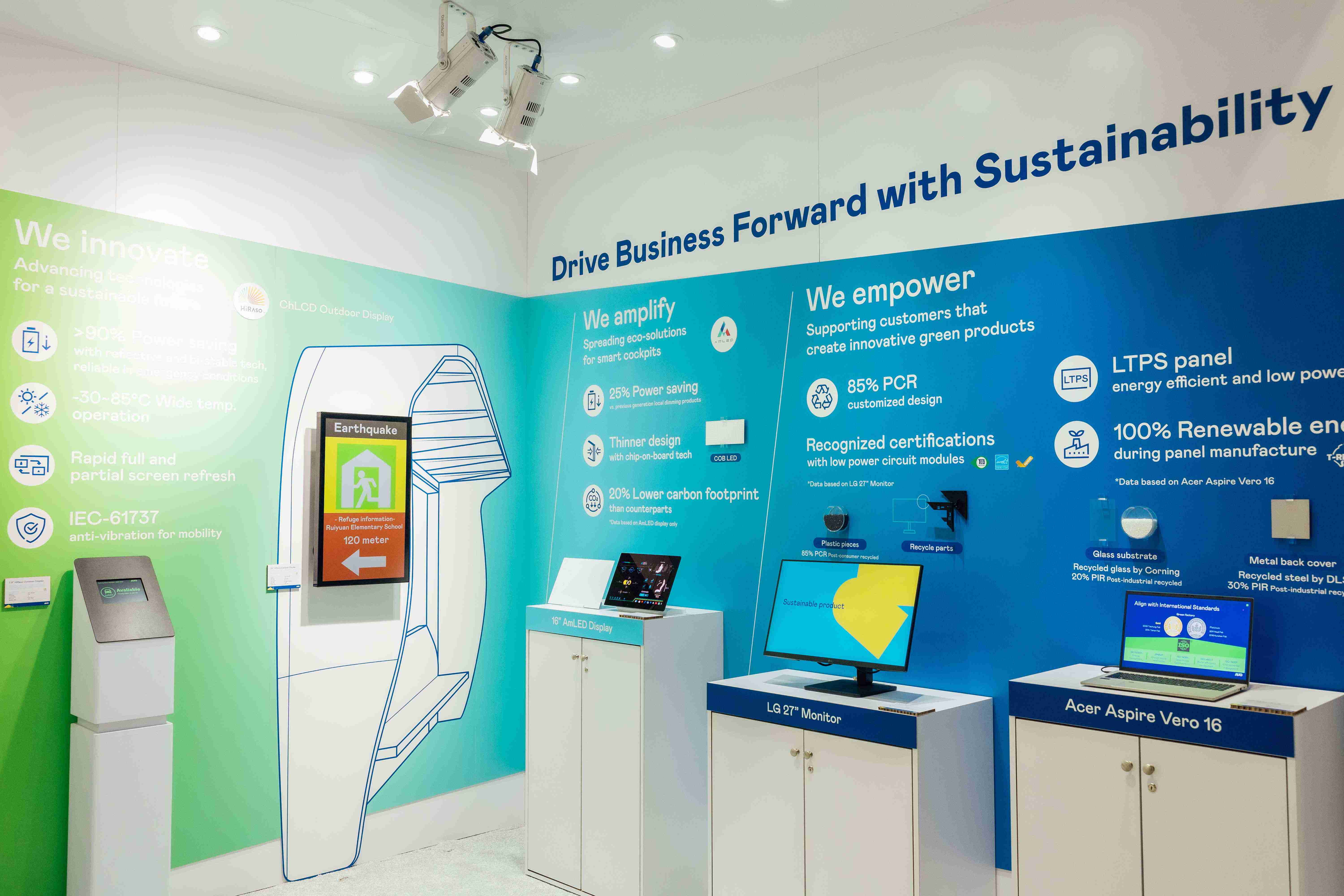 CG电子运用创新显示技术HiRaso胆固醇液晶双稳态技术达到显示零耗能、、、、扩大节能省电的AmLED显示技术应用于车用产品、、、、以再生的消费后回收(PCR)塑料及全绿电生产之面板,,,,应用于笔电及萤幕,,,增加绿色价值。。。。