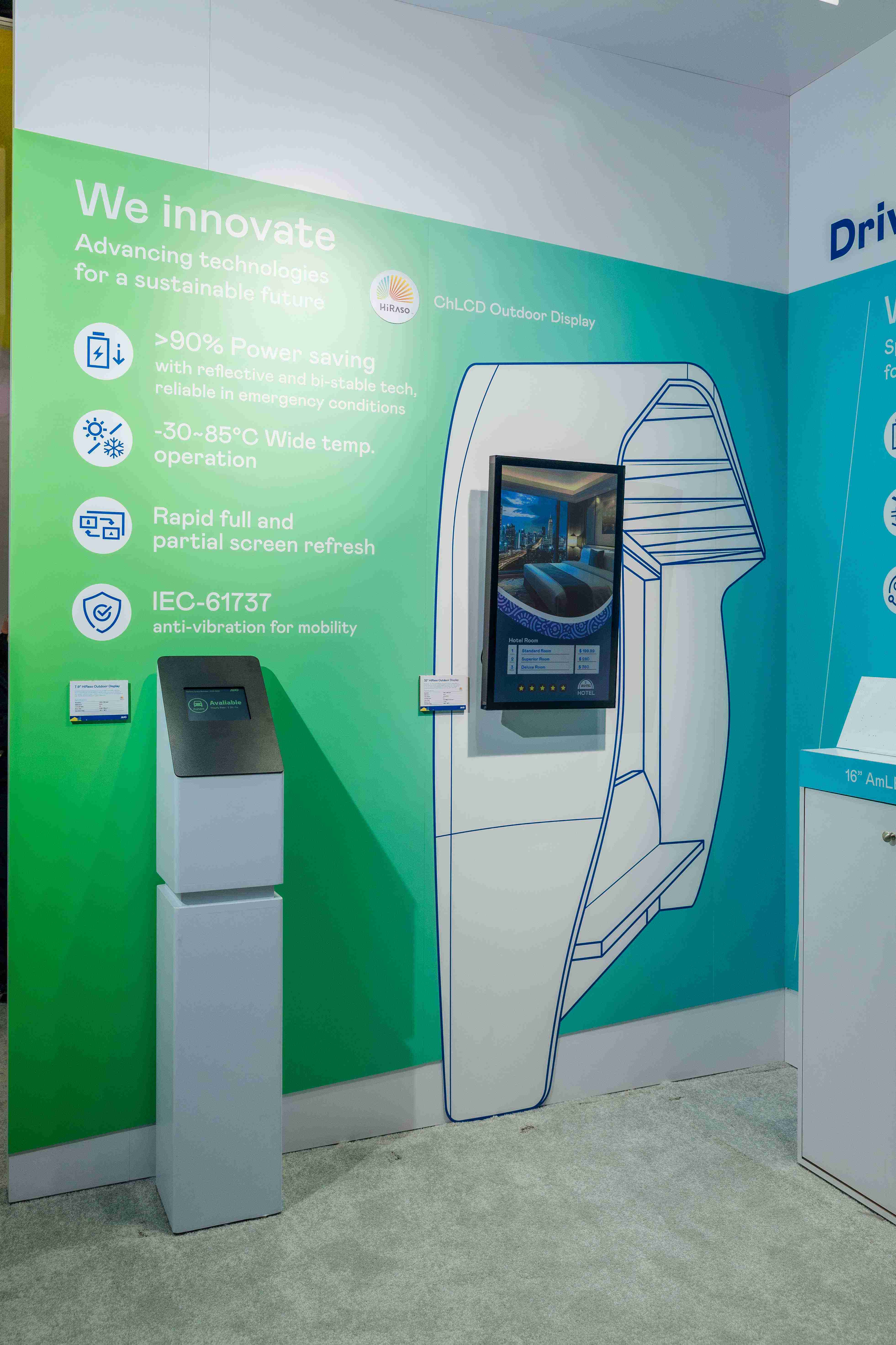 HiRaso胆固醇液晶显示器运用反射环境光线的方式,,,,呈现影像显示时零耗能的环保省电诉求,,光线愈强愈能呈现绝佳的色彩饱和度及显示效果,,,,同时在摄氏-30度至85度间宽温的使用优势,,为户外电子看板的新首选。。。